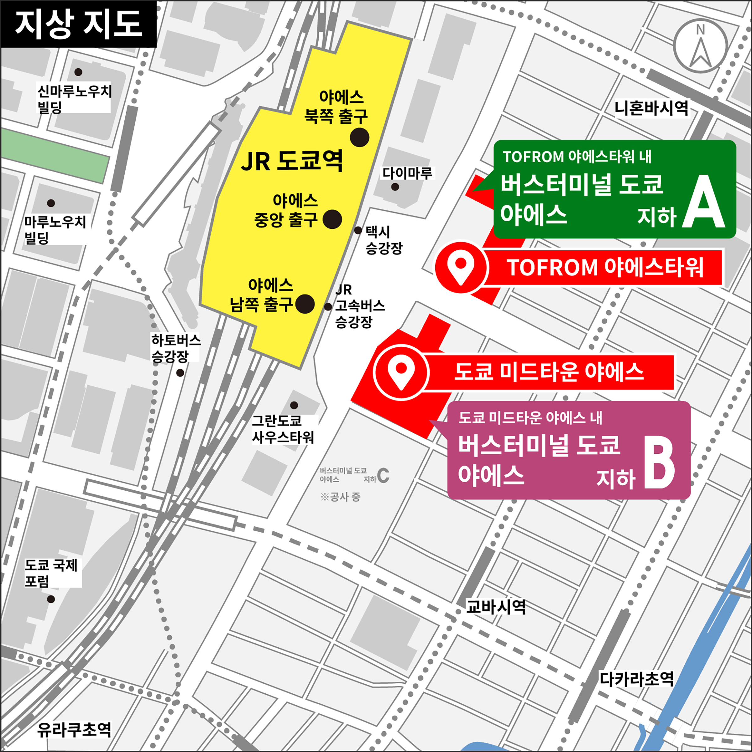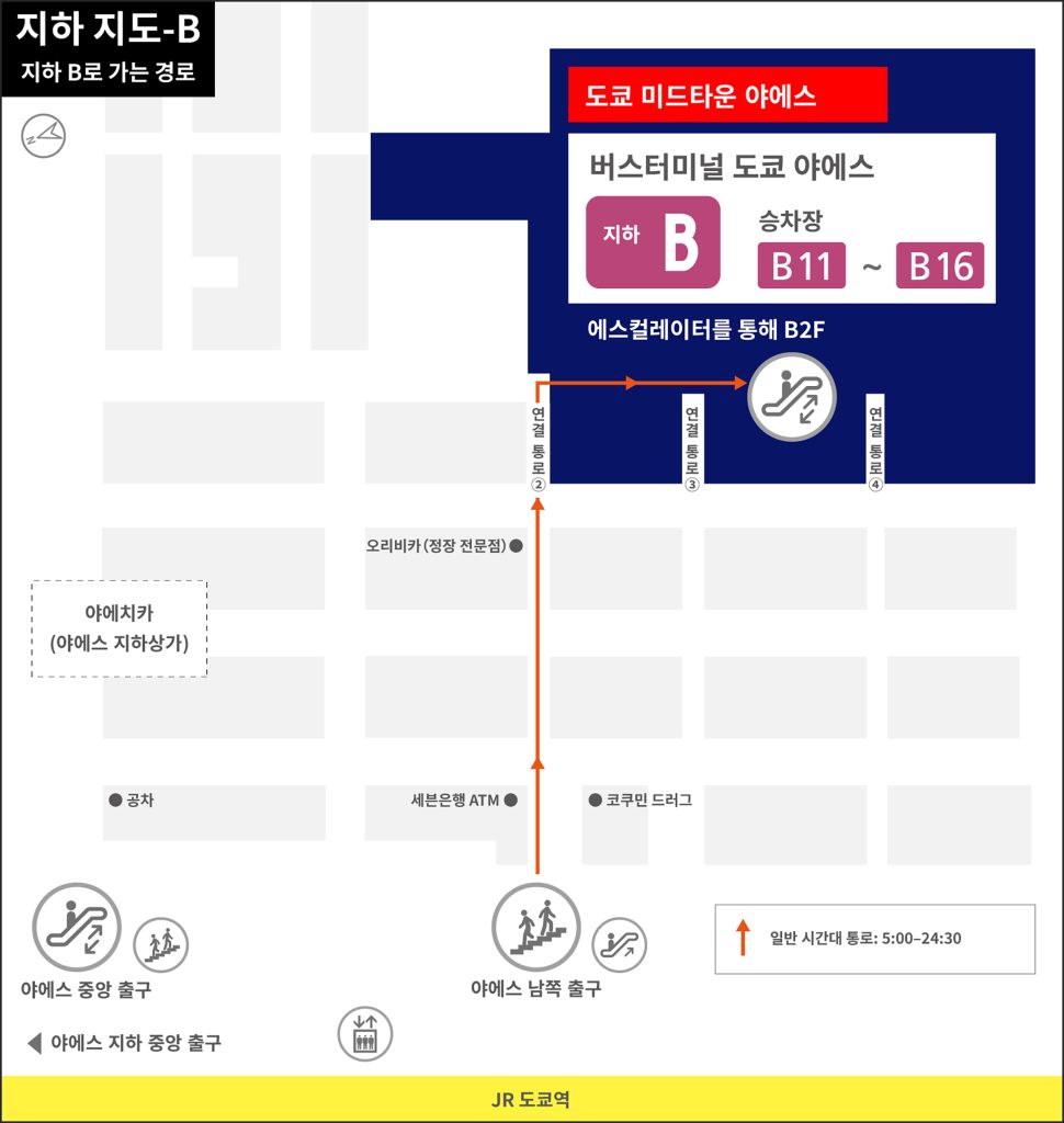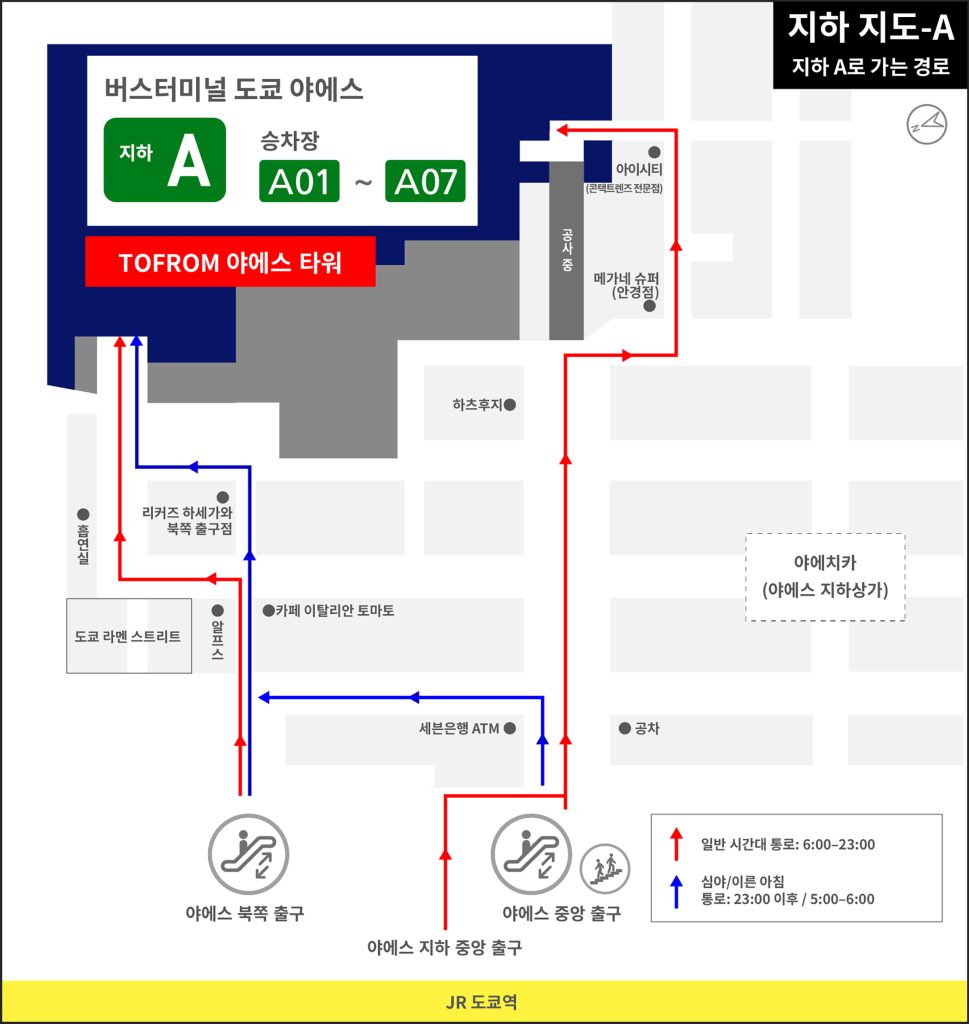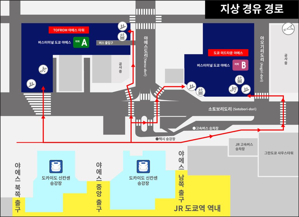※「지하 A」「지하 B」 사이의 이동은 지상을 경유해 주십시오.